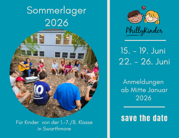 Das PhillyKinder Sommerlager wird auch im Sommer 2026 wieder in Swarthmore stattfinden. Es richtet sich an deutschsprachige Kinder von der 1.-8. Klasse. Kinder, die noch nicht in die 1. Klassen kommen, kann die Teilnahme ermöglicht werden, sofern sie von einer erwachsenen Person begleitet werden.